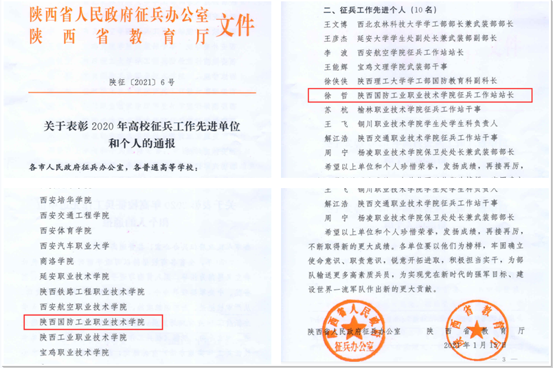 近日,陕西省人民政府征兵办公室和陕西省教育厅下发《关于表彰2020年高校征兵工作先进单位和先进个人通报》(陕征〔2021〕6号)文件。我校荣获2020年度高校“征兵工作先进单位”荣誉称号,我校征兵工作站站长徐哲同志被评为2020年度“征兵工作先进个人”。