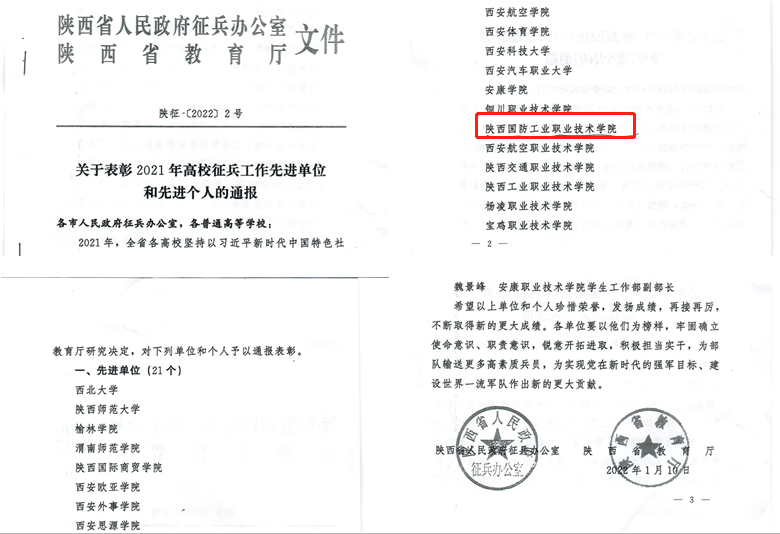 近日,陕西省人民政府征兵办公室和陕西省教育厅下发《关于表彰2021年高校征兵工作先进单位和先进个人通报》(陕征〔2022〕2号)文件。我校荣获2021年度高校“征兵工作先进单位”荣誉称号。