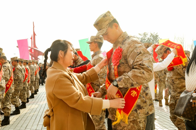 接下来,新兵家长及辅导员为新兵佩戴红花、绶带。梦想召唤,使命催征,即将奔赴祖国各地的新兵们胸戴红花、肩披红绶带,英姿勃发。