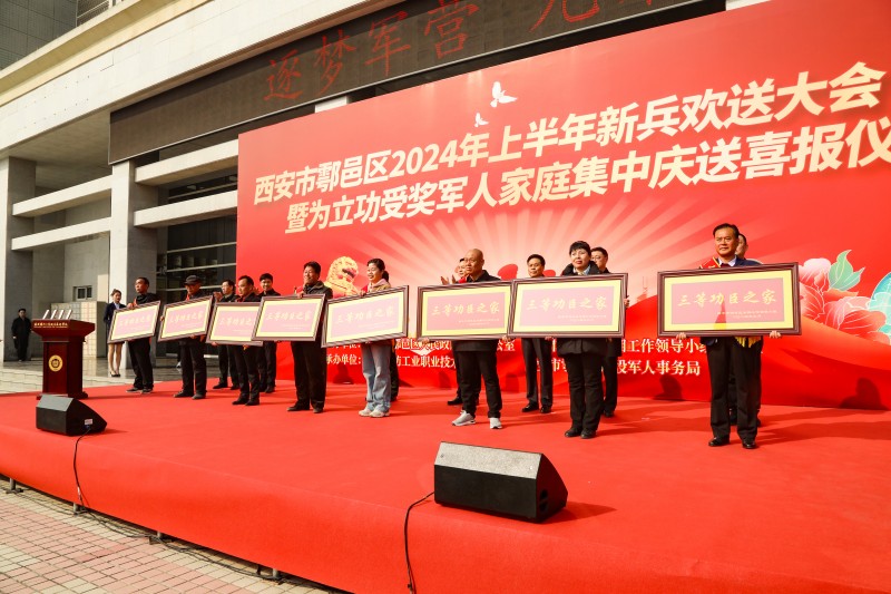2024年3月14日,由西安市鄠邑区人民政府征兵办公室、西安市鄠邑区双拥工作领导小组办公室、西安市鄠邑区退役军人事务局主办,我校协办的西安市鄠邑区2024年上半年新兵欢送大会暨为立功受奖军人家庭集中庆送喜报仪式在我校图书馆楼前举行。校长刘敏涵,区委、区政府、区人武部、区退役军人事务局、区街道武装部等相关领导,鄠邑区全体新兵、家长及立功受奖军人家属参加了仪式。人武部政委主持仪式。