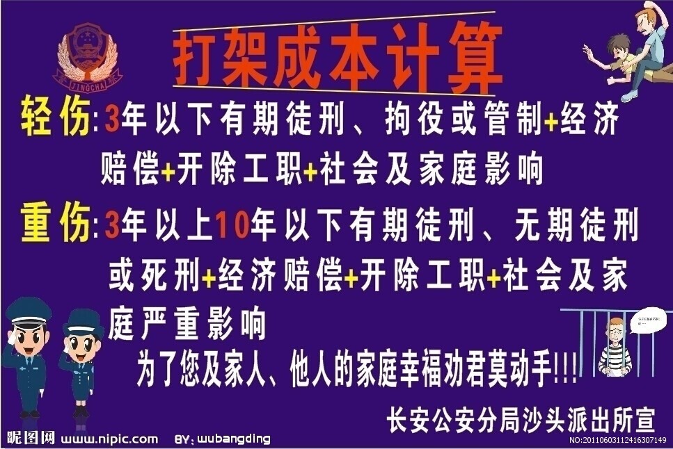 打架也有“成本”,并非空穴来风。鞍山市解放派出所将“打架成本”列得一清二楚:打架直接成本等于5至15天拘留,加上500元至1000元罚款,加上至少1000元医药费;打架附加成本等于心情沮丧低落郁闷,加上名誉形象受损,加上家人朋友担心,再加上生意工作可能蒙受更大的损失。这笔“成本”依据的法律法规,是《中华人民共和国治安管理处罚法》第四十三条。