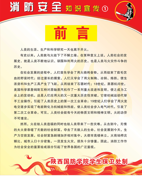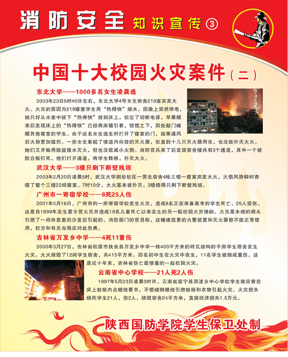 在第二十五届消防宣传周之际,为进一步提高广大师生的消防安全意识,杜绝消防安全隐患,能使广大师生熟练掌握各类消防器材的使用,在发生重大火灾的情况下能顺利逃生,保卫科精心制作了一批展板,将在公寓楼、教学楼、餐厅等场所向大家宣传消防安全知识,同时,也诚恳的希望大家能够认真学习。提高消防意识,共建和谐校园。