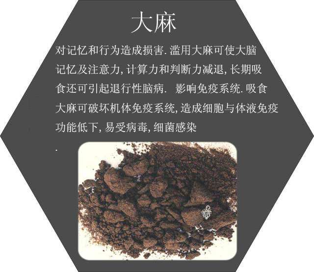 大麻主要有三种形态:大麻脂、大麻油。大麻通常被制成大麻烟吸食,或作大麻饮料饮用,或掺入食吕品中食用,亦可咀嚼、鼻吸或吞服。凡吸食大麻者,学习能力和记忆力减退,意志消沉,形成“堕落综合症”,行为失去自控,突然产生暴力进攻的欲望,往往会实施暴力犯罚。
