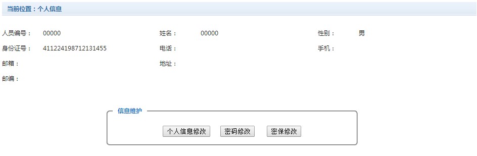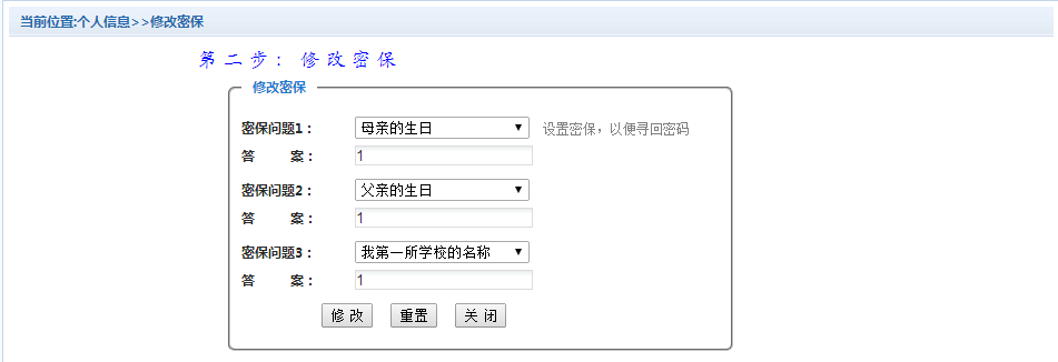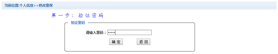 点击“密保修改”按钮,显示3.2.3-1、3.2.3-2所示的密保修改界面。验证完密码后,修改密保。注:密保是忘记密码后找回的重要途径,建议未设置密保人员设置密保