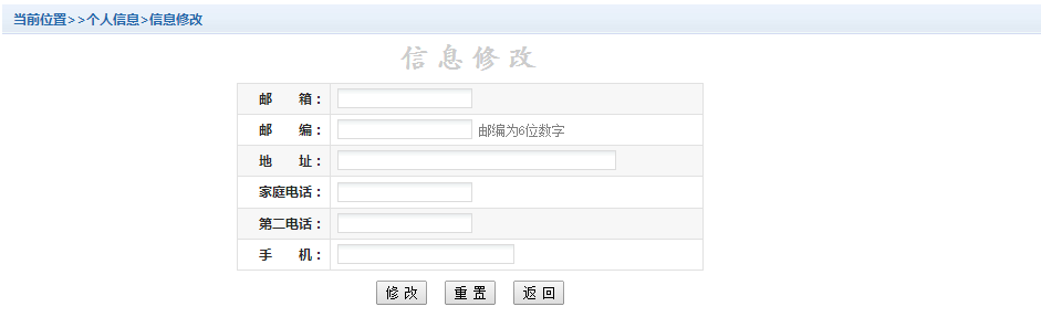 点击个人信息界面的个人信息修改,显示3.2.1-1所示的个人信息维护界面。在相应的输入框,输入需要修改的个人信息,点击“修改按钮”完成个人信息维护。未保存前,点击“重置”按钮,还原个人信息。