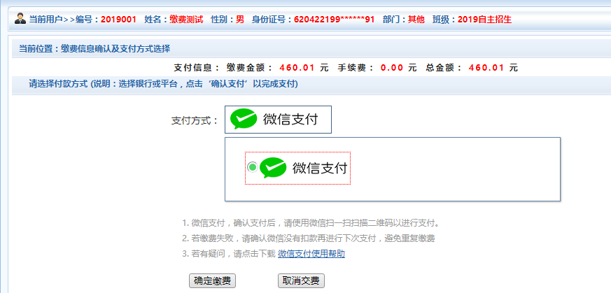 D. 缴费信息确认及缴费方式选择(目前只支持微信,后续开通网银)。如图3.4-4所示。