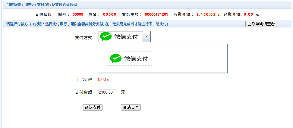 C. 确认缴费信息。选择缴费金额和缴费方式。如图3.5-3所示。点击“业务单明细查看”可查询该业务单支付情况。注:允许拆分支付时,修改金额时不能小于系统允许的最小支付金额。