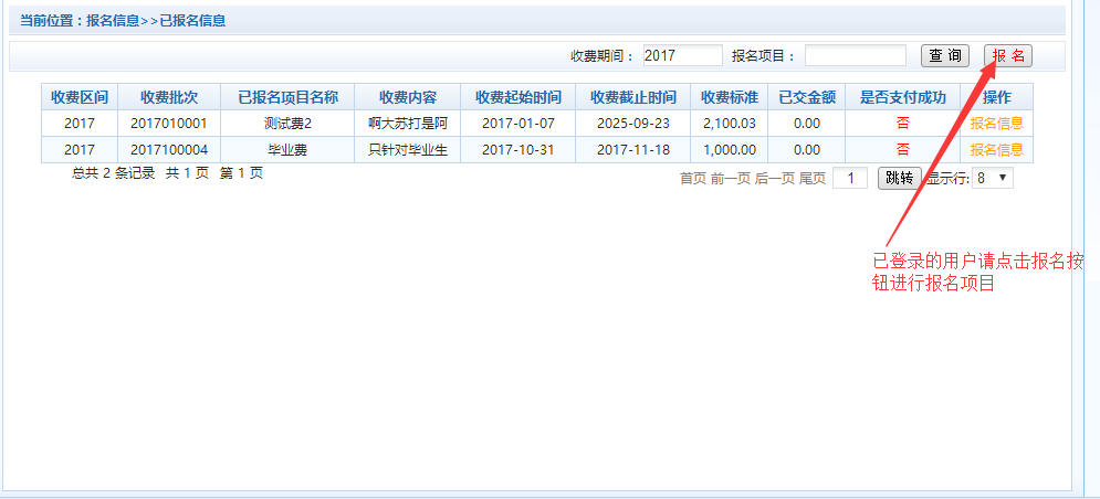 已注册用户(包括在校生、其他使用过平台缴费的人员)可以登录支付平台,点击导航栏“报名信息”界面,选择报名项目,点击“报名”按钮进行报名。如图3.8-1所示