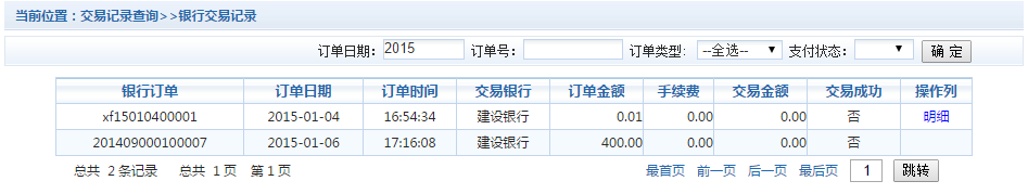 点击导航栏的“交易记录查询”按钮,可以查询具体的银行交易记录。如图3.6-1所示。