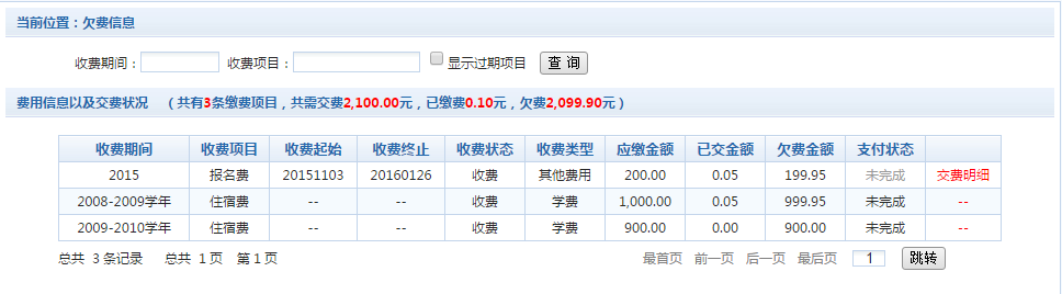 点击导航栏的“学费缴费”按钮,显示学费欠费和选择页面,如图3.4-1所示: