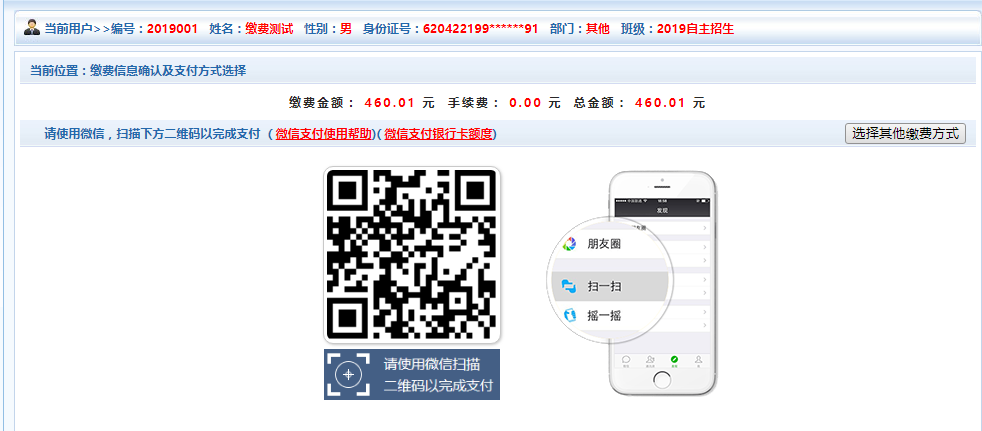 如图3.4-4所示,确定支付金额无误后,选择微信支付,生成如下图二维码,进入如图3.4-5所示