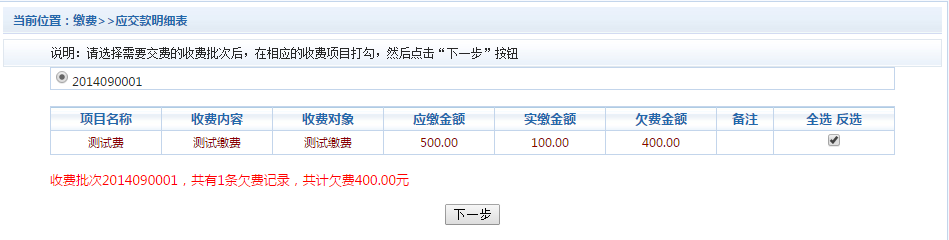 A. 选择缴费项目 确认缴费项目、金额无误,选择欠费项目,点击“下一步”。