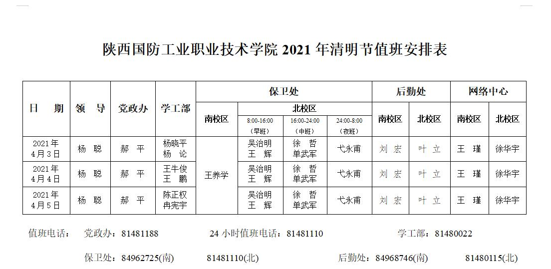 上一条:2021年五一劳动节值班安排下一条:2020-2021学年第二学期领导接待日值班表