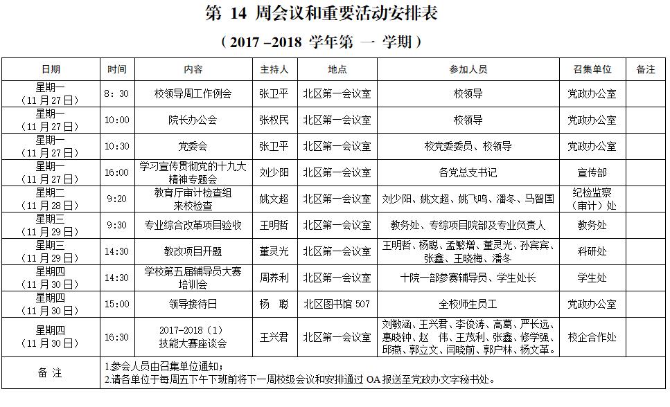 上一条:第 十五 周会议和重要活动安排表(2017-2018第一学期)下一条:第十三 周会议和重要活动安排表(2017-2018第一学期)