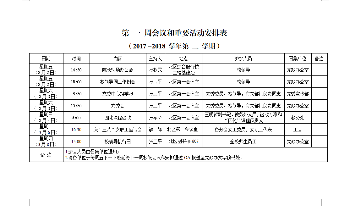 上一条:第 二 周会议和重要活动安排表 (2017 -2018 学年第 二 学期)下一条:第 二十 周会议和重要活动安排表(2017 -2018 学年第 一 学期)