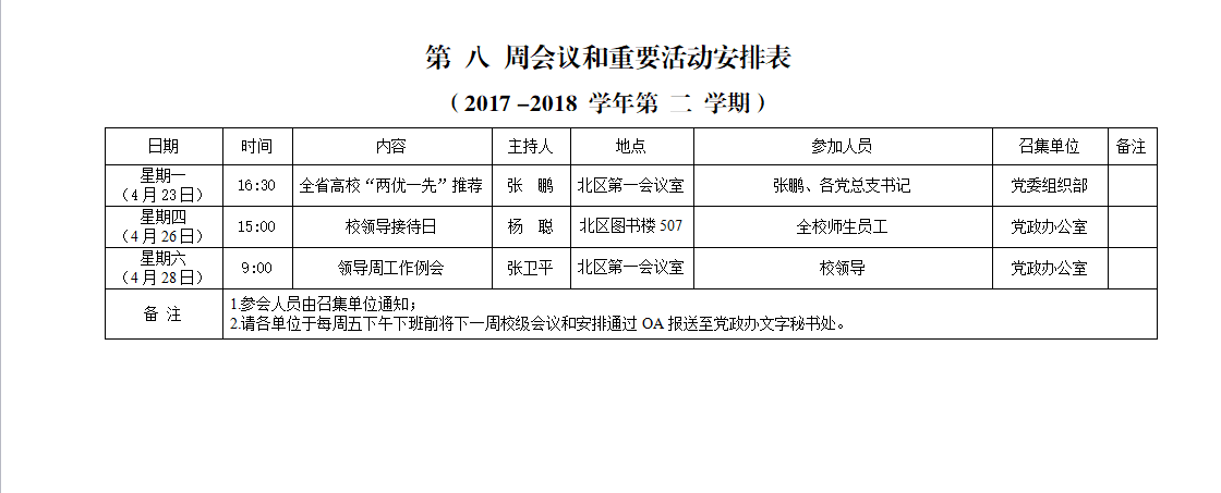 上一条:第 九 周会议和重要活动安排表 (2017 -2018 学年第 二 学期)下一条:第 七 周会议和重要活动安排表 (2017 -2018 学年第 二 学期)