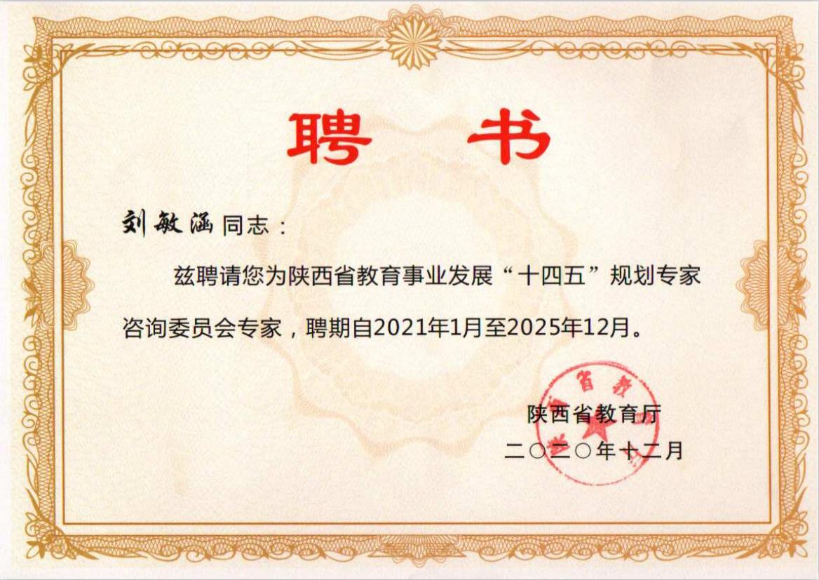 近日,陕西省教育厅为陕西省教育事业发展“十四五”规划专家咨询委员会专家颁发了聘书,我校校长刘敏涵被聘为陕西省教育事业发展“十四五”规划专家咨询委员会专家。