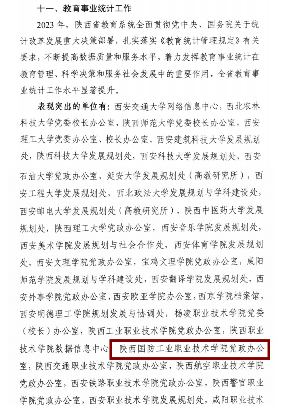近日,省委教育工委、省教育厅通报了2023年度全省教育系统单项工作表现突出的单位和个人,我校“双百工程”“教育事业统计”工作均受到表扬。在此之前,我校已连续7年荣获“双百工程”先进工作单位。