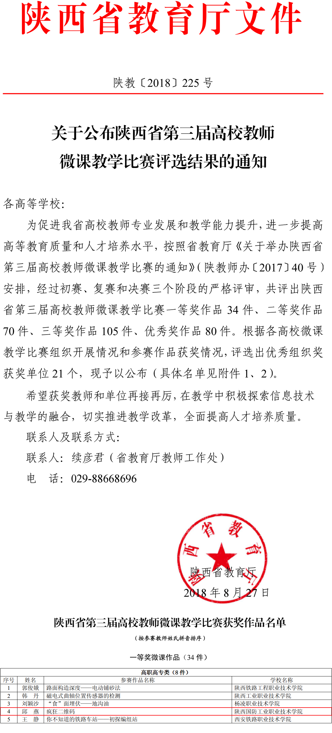 近日,由省教育厅举办的2018年陕西省第三届高校教师微课教学比赛结果揭晓,电子工程学院邱燕老师的《疯狂二维码》获得一等奖(高职高专类一等奖共8件)。