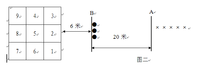 比赛开始跑向B点将沙包投向标有分值的方框中,然后快速返回到A点传棒下一人,以此类推,在规定的时间内,所有队员所投中的分值之和为本队最后得分,得分高者名次列前。要求沙包以静止落点为准判定得分,无论在哪个区域压线,均按低分得分,若压在四个边线上均得0分。