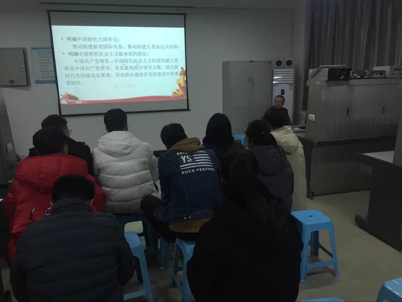 电子工程学院学生党支部于2017年12月29日晚7:30在北校区8-404室为学生支部党员和入党积极分子讲授党的十九大精神为主题的党课“全面深入领会党的十九大精神”。本次党课由分院学生党支部书记赵鹏老师讲授。赵鹏老师从八个方面对党的十九大精神作了深入的讲解分别是:1.深刻认识党的十九大的主题、主要成果;2.深刻领会习近平新时代中国特色社会主义思想;3.深刻认识党的十八大以来党和国家事业发生的历史性成就和历史性变革;4.深刻认识中国特色社会主义进入新时代;5.深刻认识我国社会主要矛盾的变化;6.深刻认识两个一百年奋斗目标的战略部署;7.深刻认识我国经济社会发展重大战略部署;8.深刻认识坚定不移推进全面从严治党的重大部署。