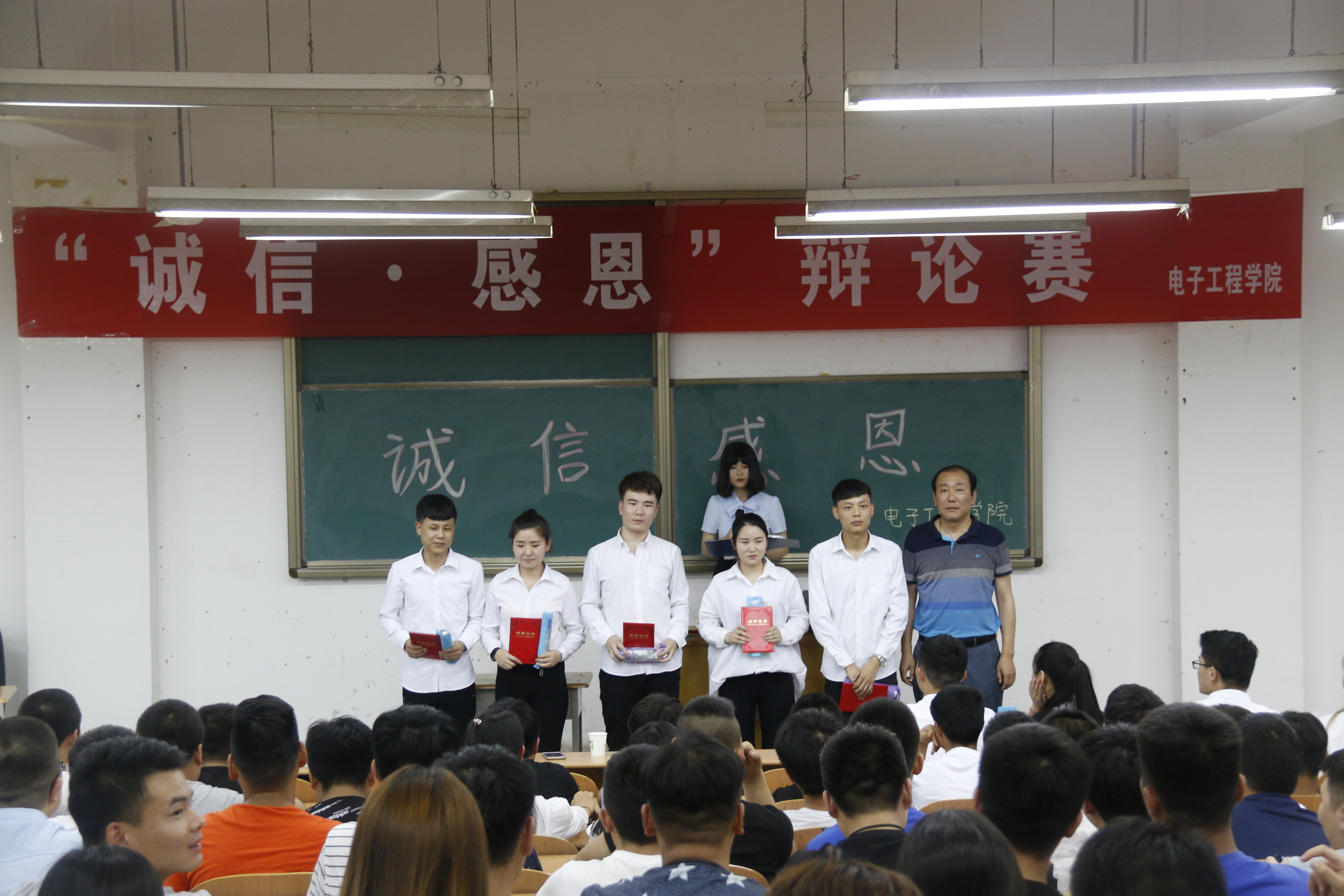 5月17日晚上19:30,电子工程学院以“诚信•感恩”为主题辩论赛”总决赛在教3-233教室举行,共有四对进行决赛比拼,同学们围绕着感恩是一种品德还是责任,是源于社会还是个人进行了激烈的辩论,整个过程中正方和反方都能列举出充分的论证和论据进行辩驳,维护自己的观点,经过激烈的角逐:信息3163班荣获得一等奖、电子3162班荣获二等奖、电子3171班荣获三等奖、无人机3171班荣获优秀奖。