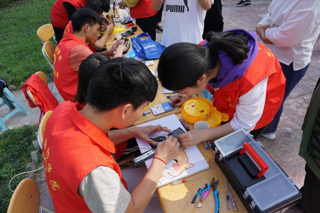 成员们开始仔细检查问题,每个人都很认真,遇到不会的问题,协会指导老师和专业老师不厌其烦的用自己的专业知识指导协会成员,在旁边观看的居民连连称赞,经过大家的努力与坚持,电水壶灯亮了、电饭煲可以工作了,电动车能正常行走了,小朋友电子类的玩具工作了等等,即使没有那么多的原件更换导致某些电器不能正常工作,同学们也对物主详细的介绍,指出是哪里出了问题,看到了一堆堆坏了的电器大部分被一一修好后,协会成员脸上露出了灿烂的笑容,因为这是对成员们的辛勤付出的肯定。