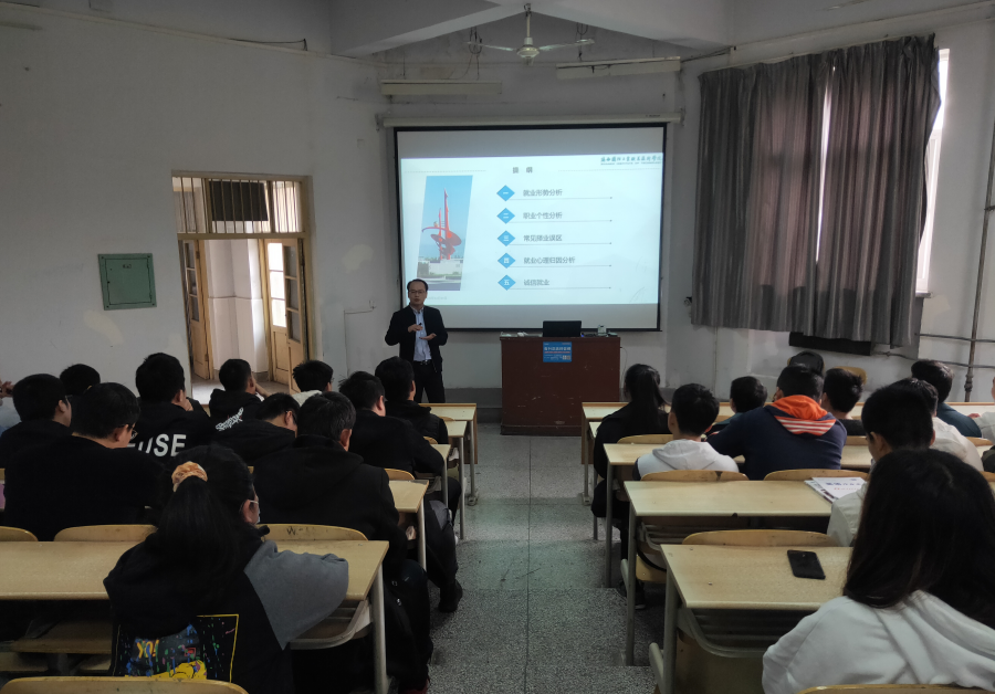 报告会上,毕业班同学认真听讲。王牛俊老师首先指出大学生就业工作对于国计民生的重要性。之后,从今年的就业形势分析、职业个性分析、常见择业误区、就业心理归因分析、诚信就业五个方面为毕业生们做了就业指导。帮助学生建构起正确的就业观念,了解到今年就业工作的国际国内重要环境和政策。进一步指导学生在就业过程中如何了解自身,在就业过程中提高人岗匹配率。并且指导学生面对就业中的种种困难,学生如何调适自己的情绪,从而保持良好的就业心态。