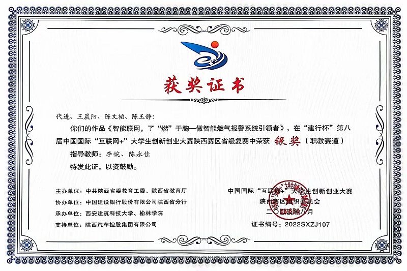 近日,陕西省教育厅公布了第八届中国国际“互联网+”大学生创新创业大赛省赛复赛的结果。我校在职教主赛道获奖27项,其中金奖8项(位居全省第一)、银奖13项、铜奖6项;“青年红色筑梦之旅赛道”获奖5项,其中银奖3项、铜奖2项。学校已连续在第七、第八两届省赛职教赛道荣获金奖数位居全省第一,已连续两届参赛的项目百分之百获奖。电子信息学院李婉、陈永佳老师指导的作品《智能联网,了然于“胸”一一做智能燃气报警系统引领者》,经过激烈角逐,获得第八届大赛职教赛道创业组省赛银奖。