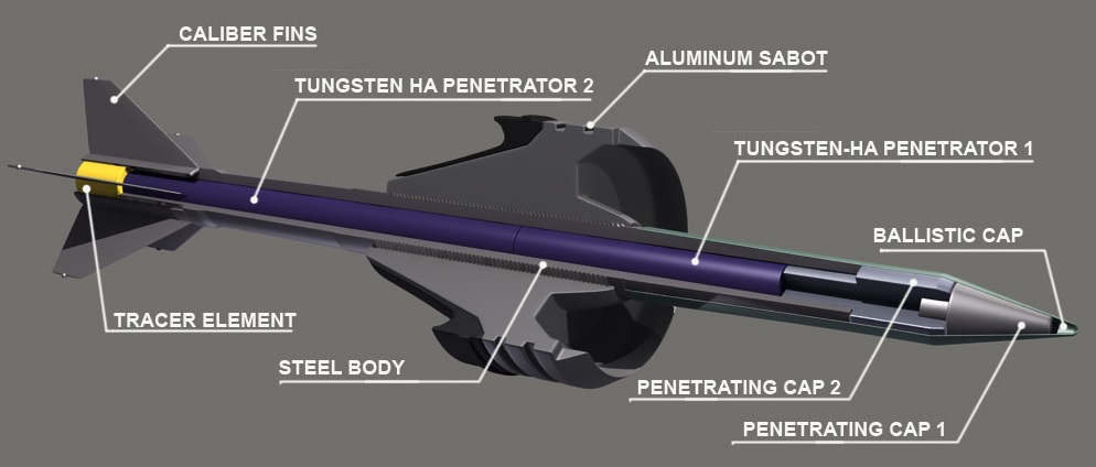 动能穿甲弹依靠自身动能打击目标,速度即威力,所以在外形设计上主要考虑减阻。穿甲弹的初速很高,一般在1500m/s以上,在有效射程内均处于超音速状态,激波阻力占到整个阻力的60%以上。因此,为了减小占大头的激波阻力,直接把弹体做成细长尖头状就行,在保证精度、弹体强度和质量足够的前提下,越细(横截面积小阻力也小)越尖(激波阻力小)越好。同时,为了不把能量浪费在自转上,穿甲弹都是用尾翼来稳定。