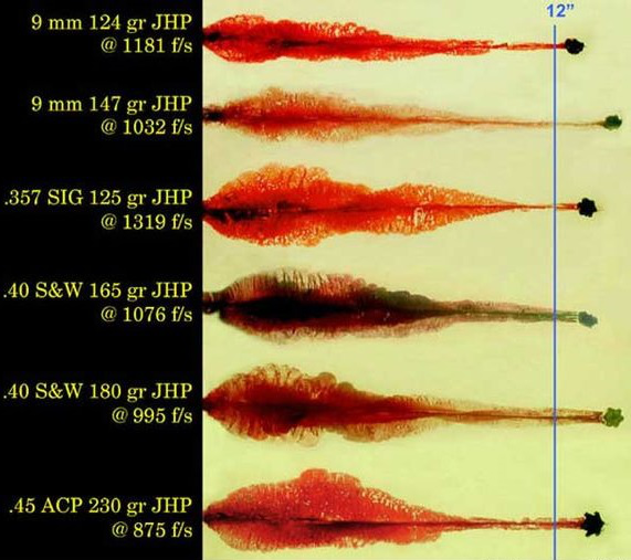 ▲各种手枪弹穿过“人体”形成的空腔