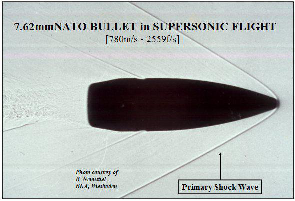 激波的产生原因可以这样解释:弹丸速度达到或超过音速时,前面的空气就来不及让开了,迭加形成的一层浓密空气。一般情况下,发展完全的激波在弹头、弹尾和弹带各处有一道强度较大的波面。每经过一道激波,压强、密度、温度都会升高,流速则下降