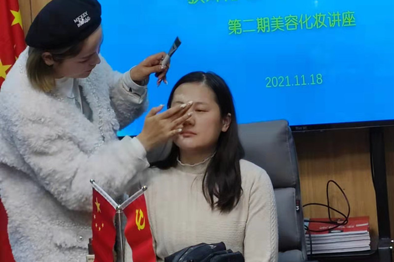 为满足广大女性教师对自身修养及形象提升的需求,培养一批内外兼修的女性教师,展现我院女教师自尊、自信、自立、自强的精神面貌,校工会联合中国银行余下支行,邀请西安资深化妆师曹庆老师,于2021年11月18日下午在北校区博逸楼一楼职工之家举行了“教师形象提升”系列活动之第二期美容化妆培训讲座活动。