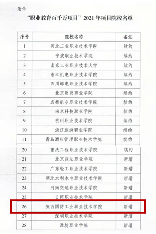 近日,中国教育国际交流协会公布了“职业教育百千万项目”2021年项目院校名单,我校成功入选。此次入选,是对我校综合办学实力和国际交流合作工作的充分肯定,也必将为我校国际化发展“请进来、走出去、再提升”工作提供更大平台和更多指导。