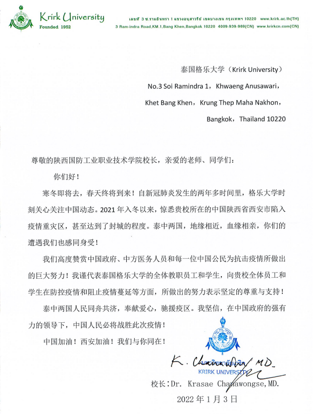 近期,新冠病毒肆虐,西安市疫情防控形势复杂严峻,牵动着全国人民的心,也牵动着海外合作伙伴的心。在全市人民及全校师生众志成城,共克时艰,不遗余力抗击疫情之时,我校收到来自泰国友好合作院校格乐大学的慰问函。
