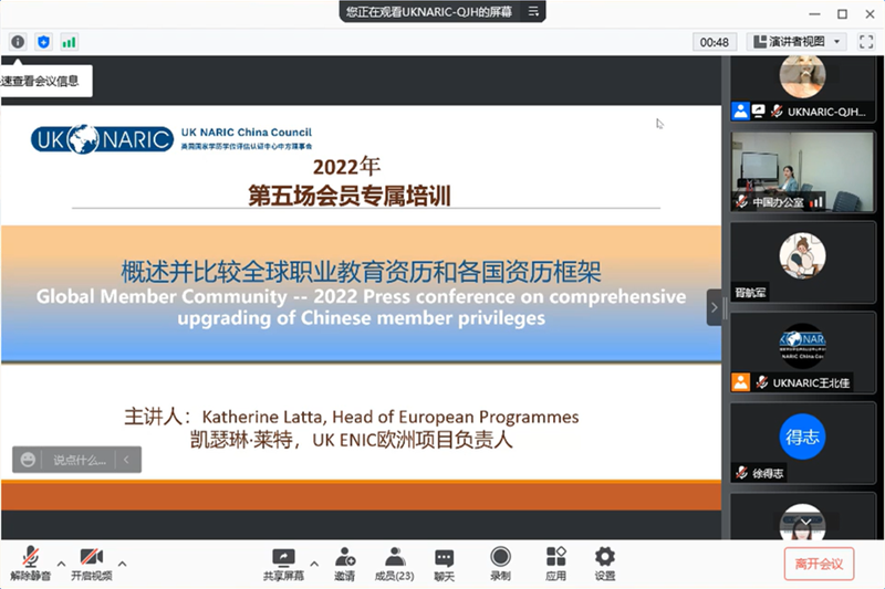 5月17日,学校参加UK ENIC 2022年第五场会员专属培训。欧洲职业教育培训专家凯瑟琳·莱特女士为参会单位讲述了题为“概述并比较全球职业教育资历和各国资历框架”的报告。我校国际交流处处长胥航军、教务处副处长吴玮玮及相关人员参加了培训。