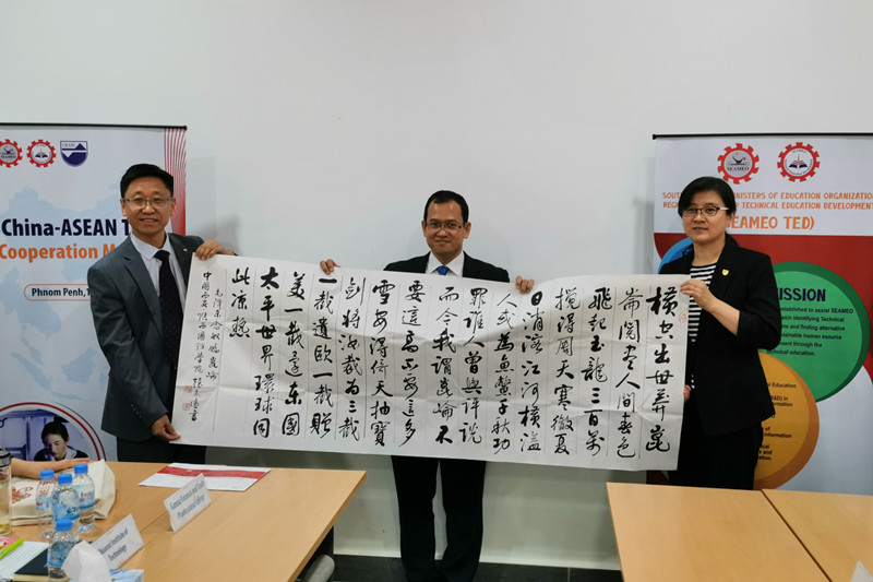 7月12日至14日,代表团访问柬埔寨国立理工学院(鲁班工坊)、东南亚教育部长组织技术教育发展区域中心,参观柬埔寨国家技术培训学院。在中柬职业院校合作洽谈会上,孟繁增与20所柬方职业院校代表进行合作洽谈。