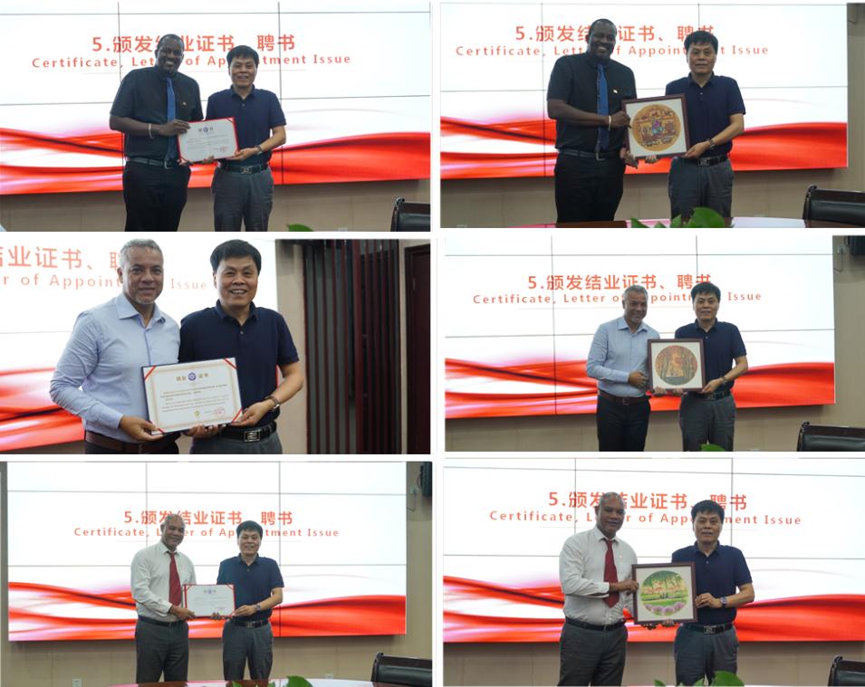 接下来,刘敏涵校长代表学校为三名塞舌尔教师颁发结业证书,赠送具有我校特色的户县农民画,并聘请三位教师为我校客座教授,塞方教师将通过在线交流的模式为我校学生开展技术技能讲座。