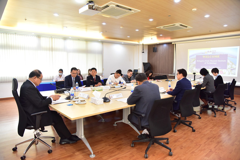 会议伊始,双方共同观看了两校宣传片。宋迈·朴萨尔在致辞中对张永军一行的到访表示热烈欢迎,并简要回顾了坦亚武里皇家理工大学的办学历程和人才培养模式。张永军简要介绍了我校的基本情况。他指出,我校于2019年获批教育部人文交流经世项目,与坦亚武里皇家理工大学、北京华晟合作共建中泰“经世学堂”“秦岭工坊”。该项目于2022年正式落成揭幕,是陕西省第一个中泰“经世学堂”,为中泰教育大开放、大交流、大融合提供了交流契机。接下来,双方围绕课程认证、专业认证、人才培养方案认证等方面交换意见。张永军表示欢迎宋迈校长一行访问我校,双方携手共同构建中泰教育共同体。