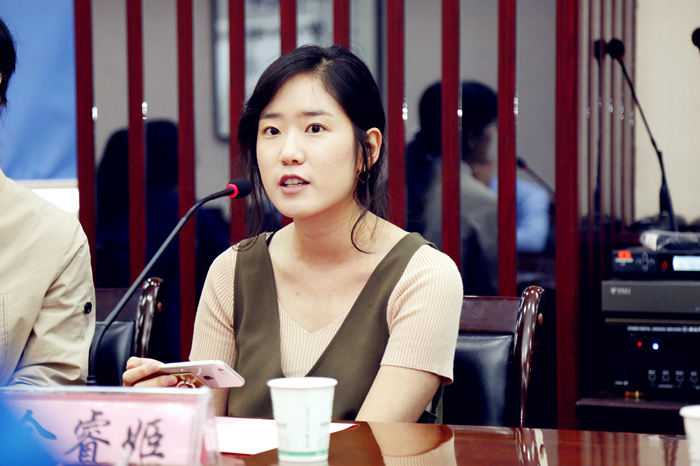 金睿姬老师对到校一年以来的工作和生活进行总结,感谢学院领导及同事在工作和生活上的关系和帮助。金刚贤老师做自我介绍,表示将努力工作,把中韩两国互派语言教师的这一棒接好。