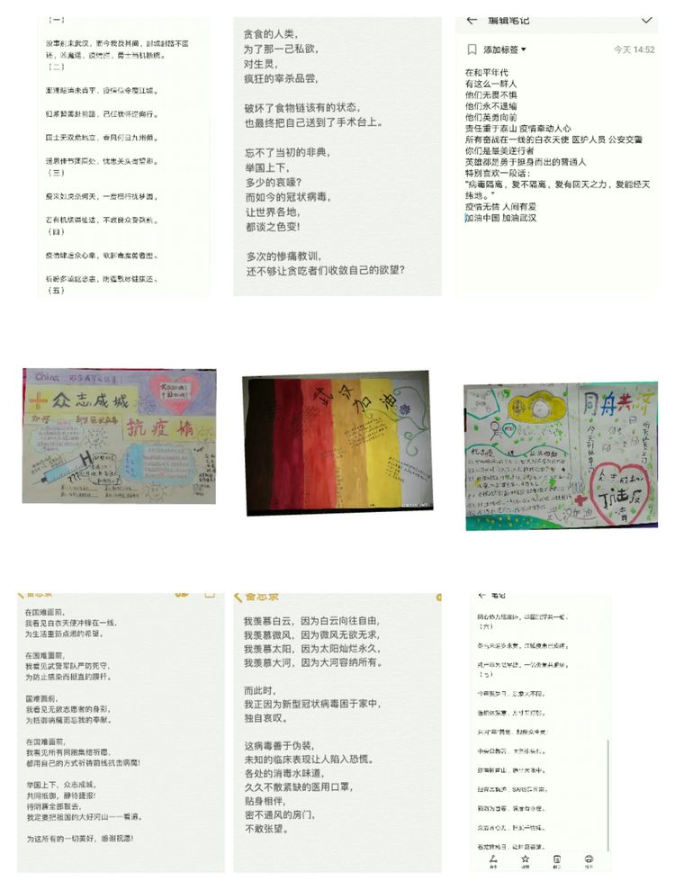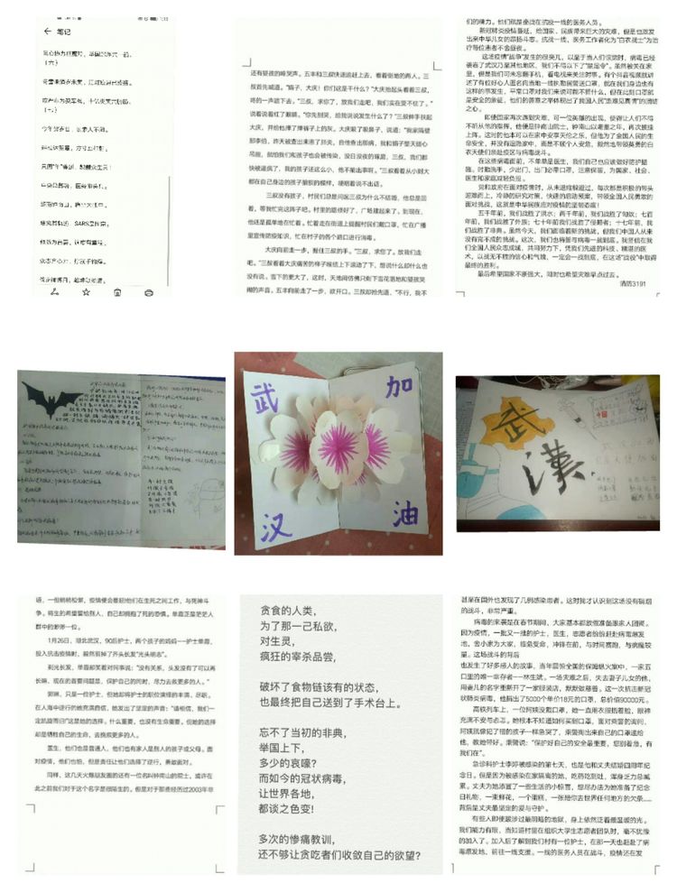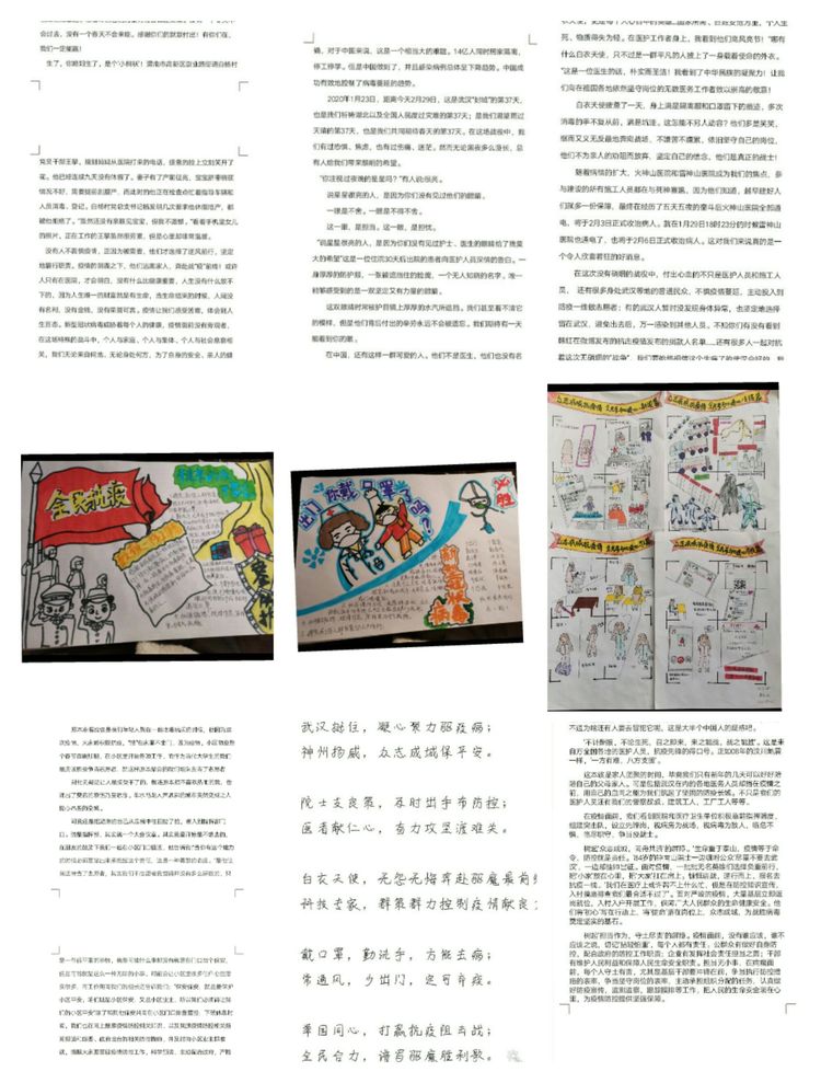 疫病无情,人间有爱。活动开展以来,学生们真情流露,佳作纷呈。学生们根据所见所闻,或讴歌反应及时、精准施策的人民政府,或赞扬勇于逆行的医务人员,或称誉敢于担当职责的公职人员,或赞许各行各业坚守岗位服务百姓生活的超市、药店工作人员和冲锋在前的志愿者,或为一线防疫的工作人员加油打气,或呼吁身边人保护地球从我做起。