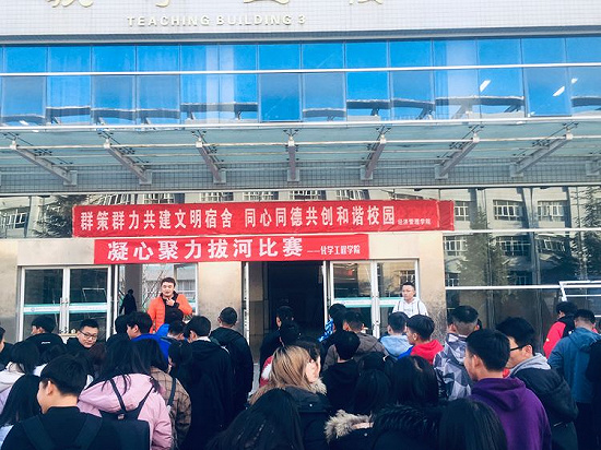 为了丰富学生的课余文化生活,增进学生之间的交流,培养学生的团队协作能力,2018年12月17日,化学工程学院在教三门口举办了“凝心聚力”拔河比赛,全体化工学院的同学纷纷以极大的热情参与到这次活动中。
