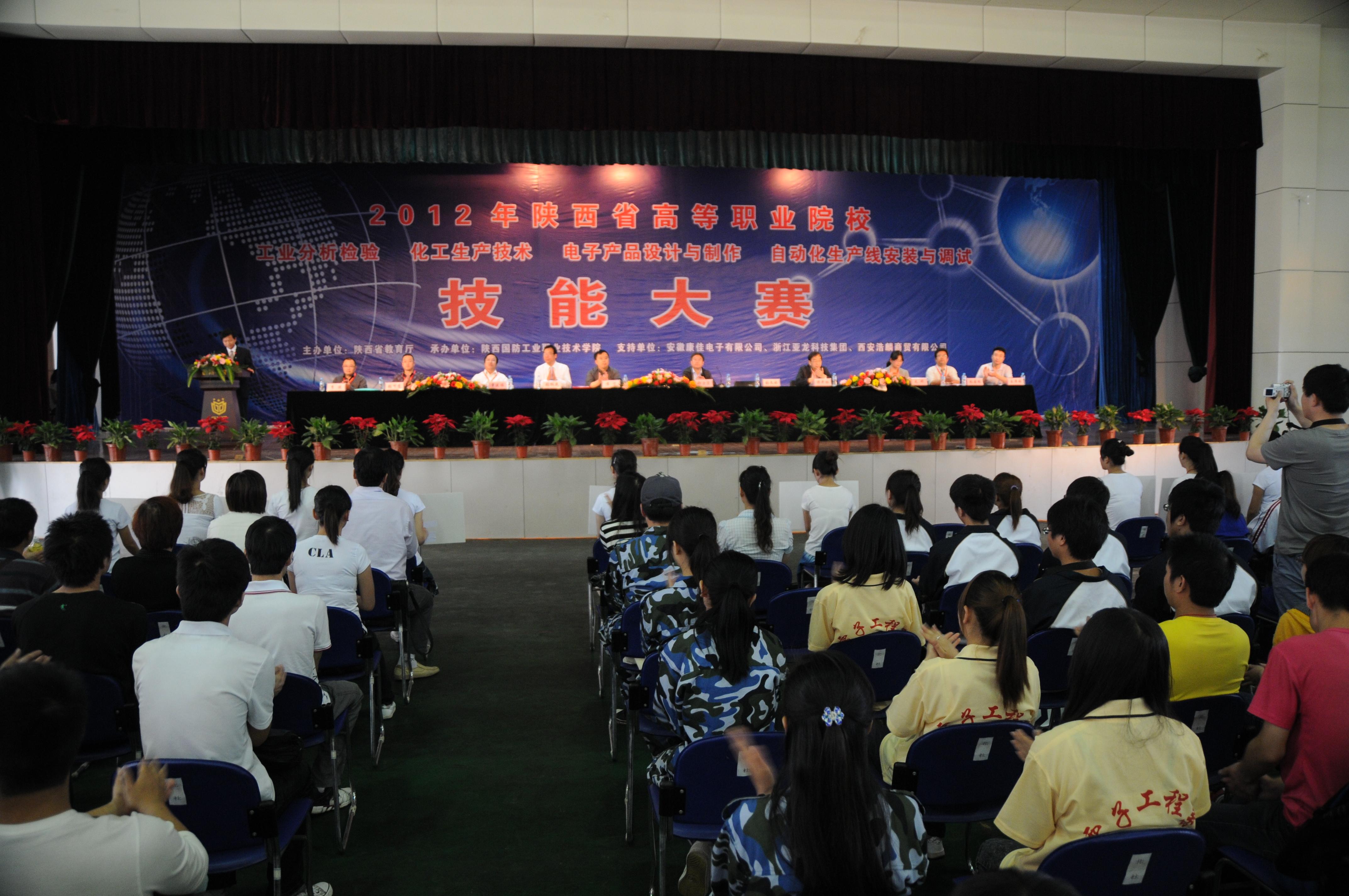 2012年5月5日,陕西省高等职业院校技能大赛在我院隆重举行,本次大赛由陕西省教育厅主办,betway必威中文正版承办,安徽康佳电子有限公司、浙江亚龙科技有限公司、西安浩麟商贸有限公司等协办,政府、高校、企业三方合作,通过技能大赛,共同推进高端技能型人才的培养,充分展示高职教育办学成果。大赛共设自动化生产线安装与调试、电子产品设计与制作、化工生产技术和工业分析检验4个竞赛项目,将有来自18所高职院校的191名选手在4个赛场上切磋技艺、交流经验、展示风采。