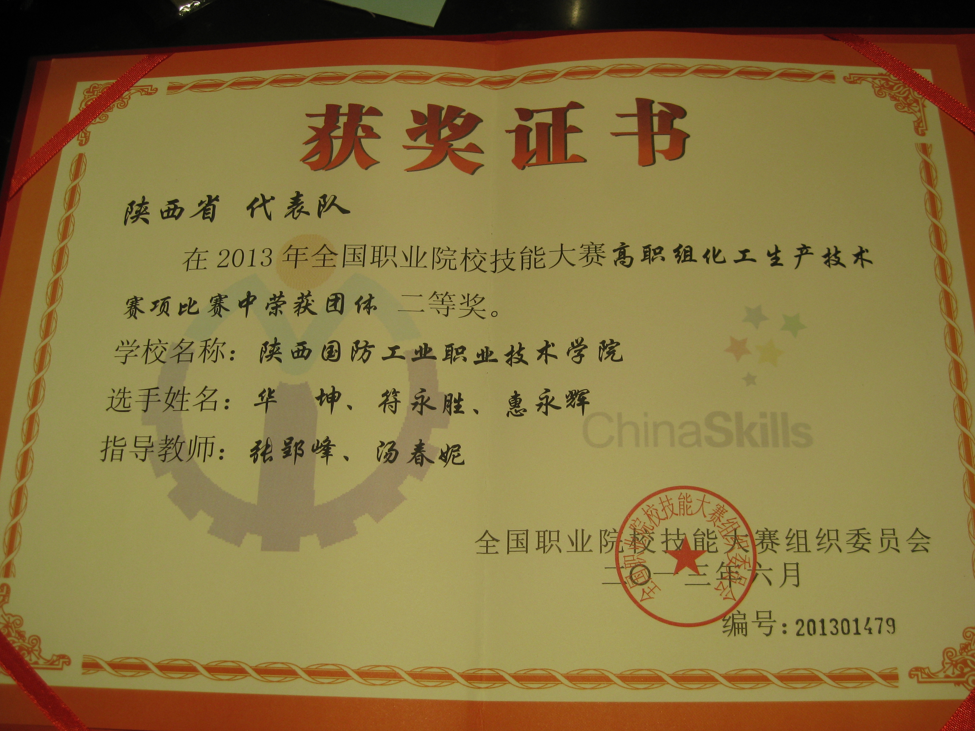 6、2013年4月获“陕西省职业院校技能大赛”化工生产技术赛项团体一等奖;