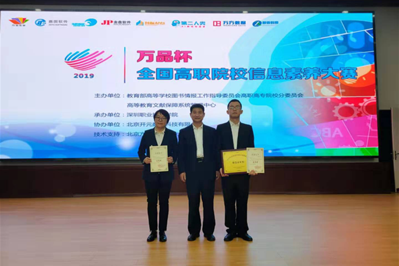 2019年12月4至6日,全国首届高职院校信息素养大赛全国总决赛在深圳职业技术学院举行。经过激烈角逐,我校图书馆馆员任天娟、学生姚鹏分别荣获教师组和学生组优秀奖,我校因组织得力,参赛积极,信息化安全到位,荣获“最佳安全奖”。