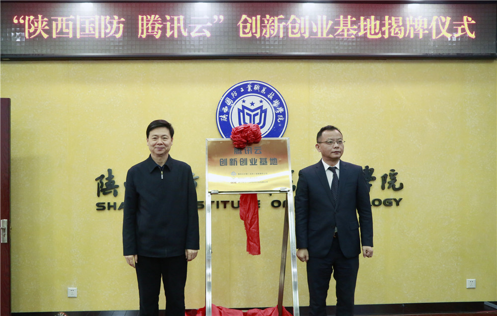 会上,南京第五十五所技术开发有限公司余云峰总经理和张卫平书记共同为“陕西国防·腾讯云创新创业人才培养基地”揭牌。