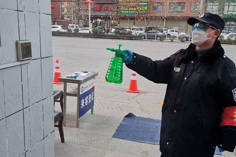 保卫人员对重点部位进行消毒,坚守岗位,筑牢防线。