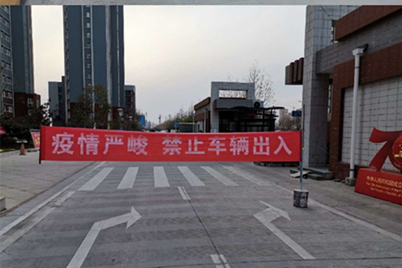 学校关闭了车辆出口,并张贴宣传横幅,提醒校内人员做好防疫工作。