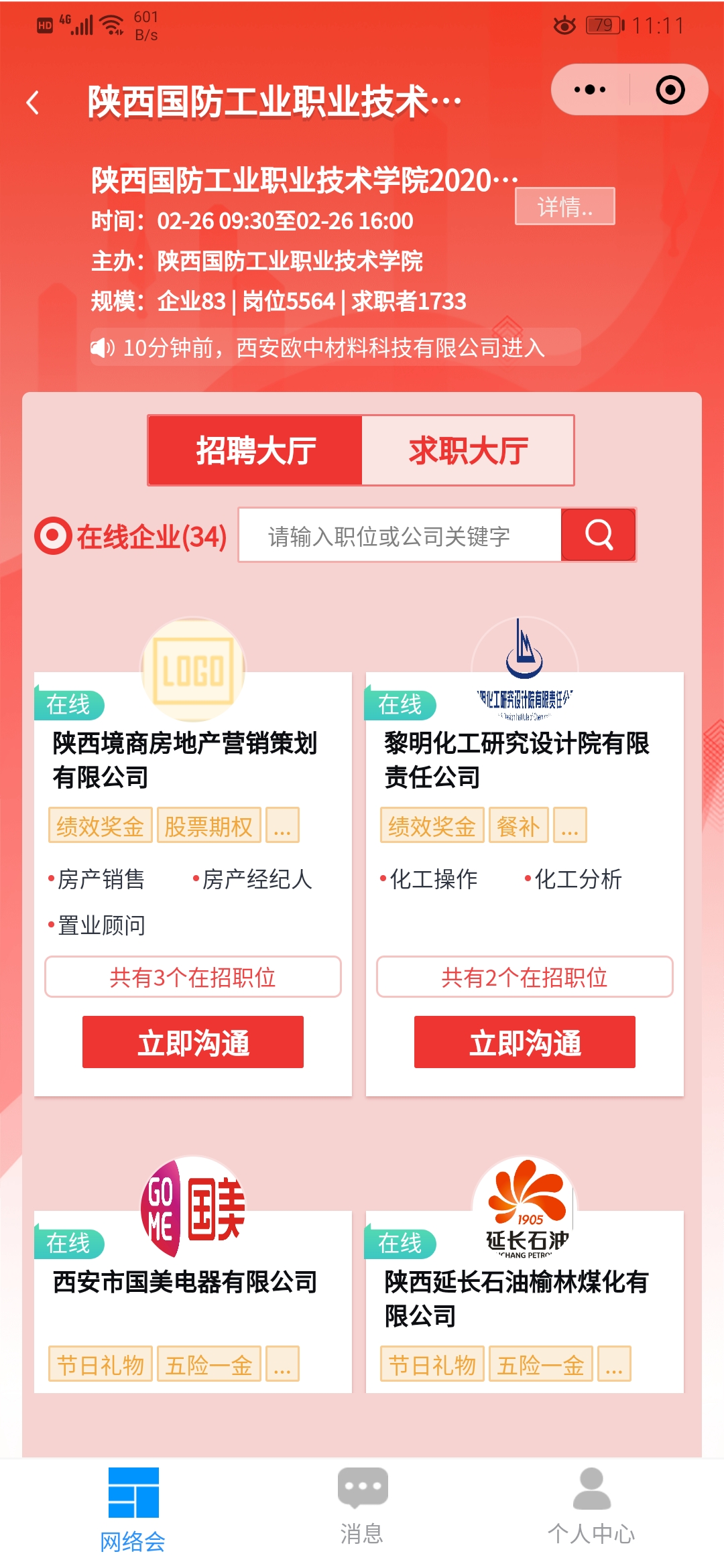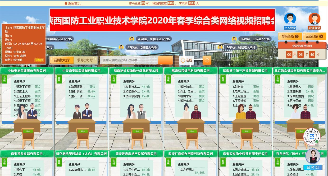 本次网络视频招聘会充分利用“互联网+就业”新模式,企业和毕业生均通过网络注册参与招聘会,每个企业有自己的专属“面试间”,毕业生在企业在线的时间段点击应聘的单位,可以随时随地与HR交流沟通,使身在异地的企业与毕业生双方足不出户轻松实现在线即时网络交流面试。