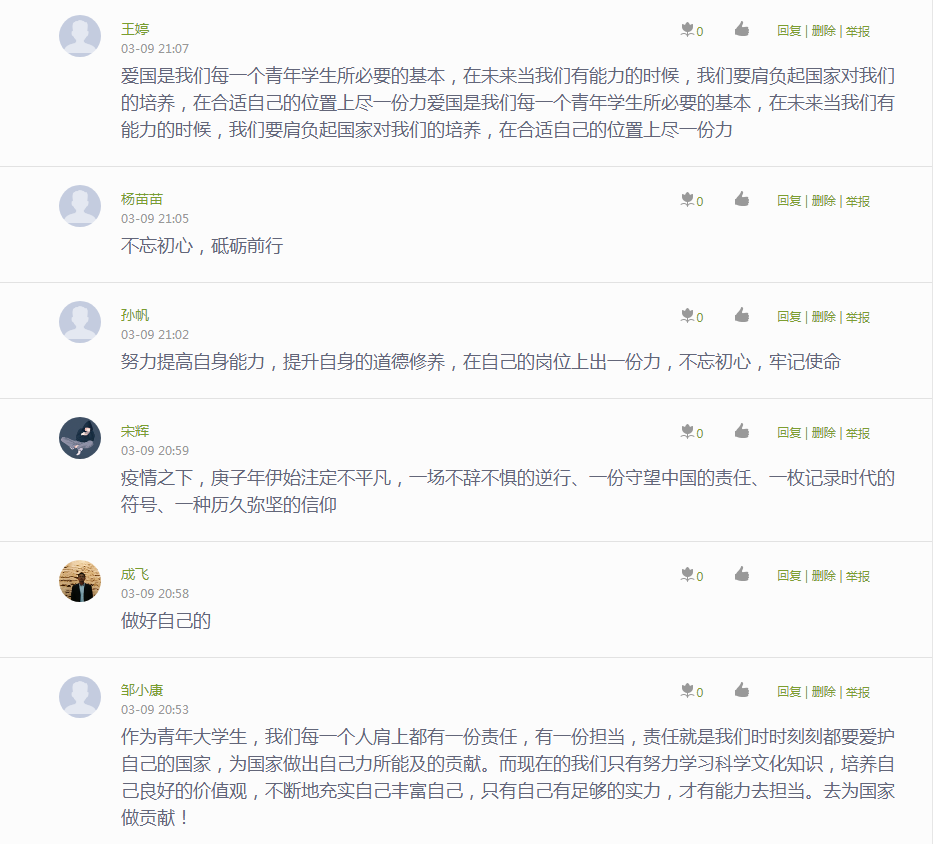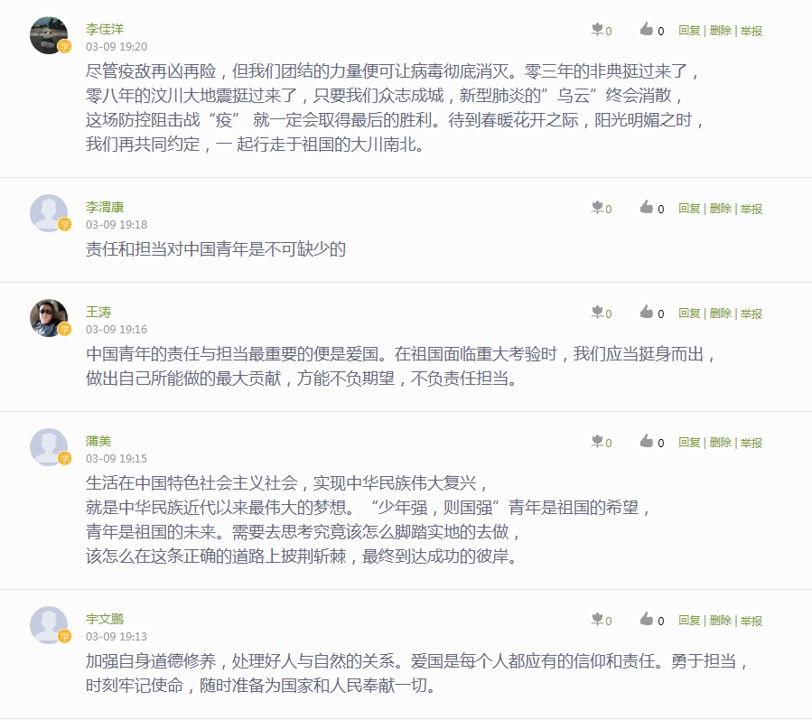 马克思主义学院张贺说:“中国的大国力量在此次疫情防控中被充分地体现了出来。此次战‘疫’,我们中国人民最大的法宝,就是党领导下的中国特色社会主义的制度优势。疫情爆发以来,党中央统一部署、协调各方,上自习近平总书记亲自指挥、亲自部署,各级党委政府积极行动,下至基层党组织雷厉风行,疫情很快得到了有效控制。这期间的中国,在党的领导下所展现出的组织能力,动员能力,这样的大国力量是其他国家很难做到的。这次疫情战役,提醒我们还要进一步完善国家治理体系,尤其是要建立完整的重大疫情防控机制,提升人民的环保观念,建立更加出色的公共医疗卫生环境。相信在此次疫情过后的发展中,我们国家会更强大,人民会更团结,中华民族伟大复兴一定会如期实现。”
